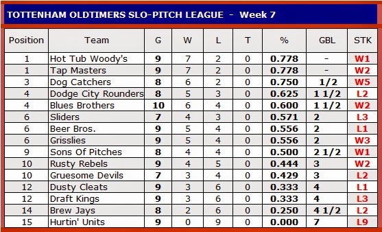 Hot Tub Woody's Vs. Draft Kings - The Hot Tub Woody's were trying to rebound from their first loss since May 21st and the Draft Kings were trying to climb back to the .500 mark. The Woody's counted 4 in the first but their lead was short lived as the Draft Kings got 6 of their own in the bottom of the inning. The Woody's kept pecking away and the Draft Kings offense was shut down. At the end of 5 innings the score was 12-6 in favour of the Woody's. The Draft Kings would fight back over the 6th and 7th, scoring six more to count 12 runs in total, but the the Hot Tub Woody's got one in the 6th to escape with a narrow 13-12 win. Chuck Cragg was perfect for the Kings going 4/4 with 2 runs scored; while Pete Hayward led off and went 5/5 with 2 runs for the Woody's. Troy Hope and Grod Robinson were both 4/4 with one run in the Woody's win. Oh, Troy has officially shed the nickname of "there's no". (think about it, you'll get it). So not only did Troy get 4 hits in this one; but he made the game saving catch in this game. Steph Simard led off the 7th with a hit. After two quick outs, Jerry Muirhead would deliver Steph's run bringing the Draft Kings within 2. Stef Kapp would cash Jerry to narrow the gap to a single run and bring Shaun Wolfe and his three hits to the plate. Shaun stung one to the gap and the game was seemingly tied until Troy "needs no" Hope came out of nowhere plug the gap, making the catch on the dead run and saving the game!